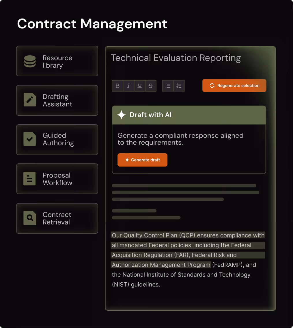 A suite of tools that centralizes and streamlines the federal bidding and contracting process, from initial proposal generation through award and ongoing contract administration.